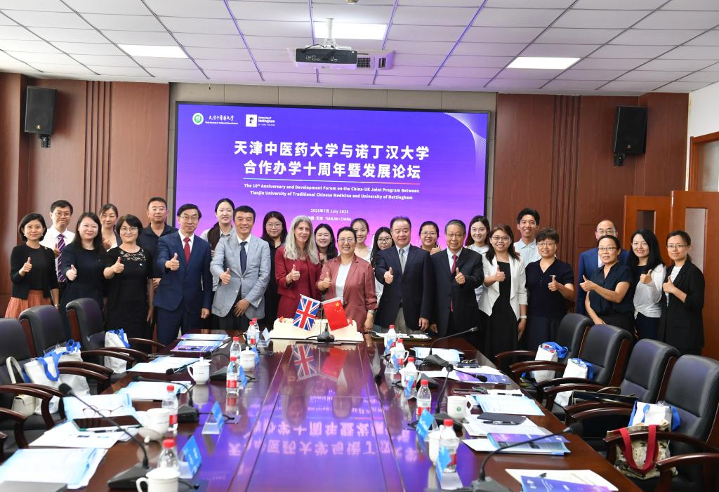 7月14日,天津中医药大学与英国诺丁汉大学合作办学十周年暨发展论坛在天津中医药大学国际教育学院举行。英国诺丁汉大学副校长Zoe Wilson教授,天津市教委二级巡视员张健青,我校校长高秀梅、副校长邱峰、副校长郭义、王耀刚教授出席,诺丁汉大学药学院专家、国际合作负责人,我校国际交流与合作处、国际教育学院、中药学院、医学技术学院等相关学院部门负责人、师生代表、合作办学项目校友代表参会。