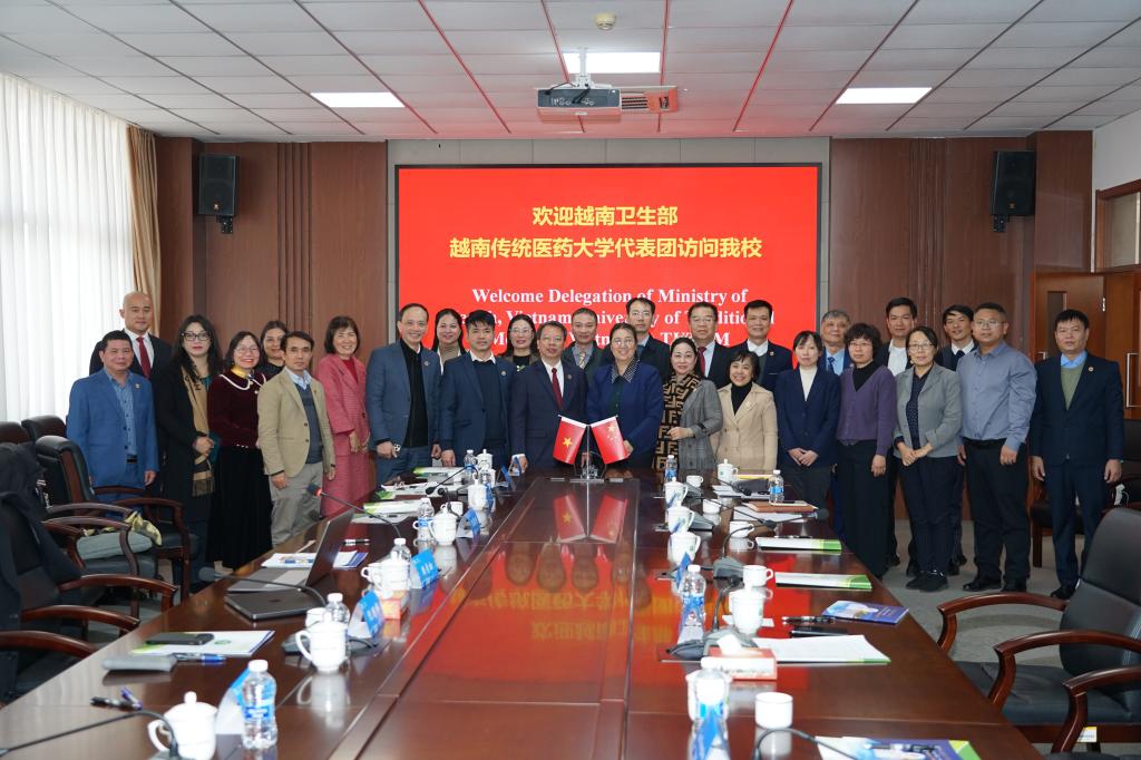 2025年12月18日至19日,越南传统医药大学代表团一行21人访问天津中医药大学。代表团由越南传统医药大学校长阮国辉带队,成员包括越南卫生部药材研究院院长陈明玉、河东传统医学医院院长阮德明,以及越南传统医药大学教学、科研及管理负责人等。中国工程院院士、天津中医药大学名誉校长张伯礼、党委书记刘革生、校长高秀梅、副校长郭义接待了代表团一行并进行了友好的交流。市卫健委中医综合处副处长杨玥出席会谈。针灸推拿学院、国际教育学院、教务处、国际交流合作处相关部门负责同志参加。