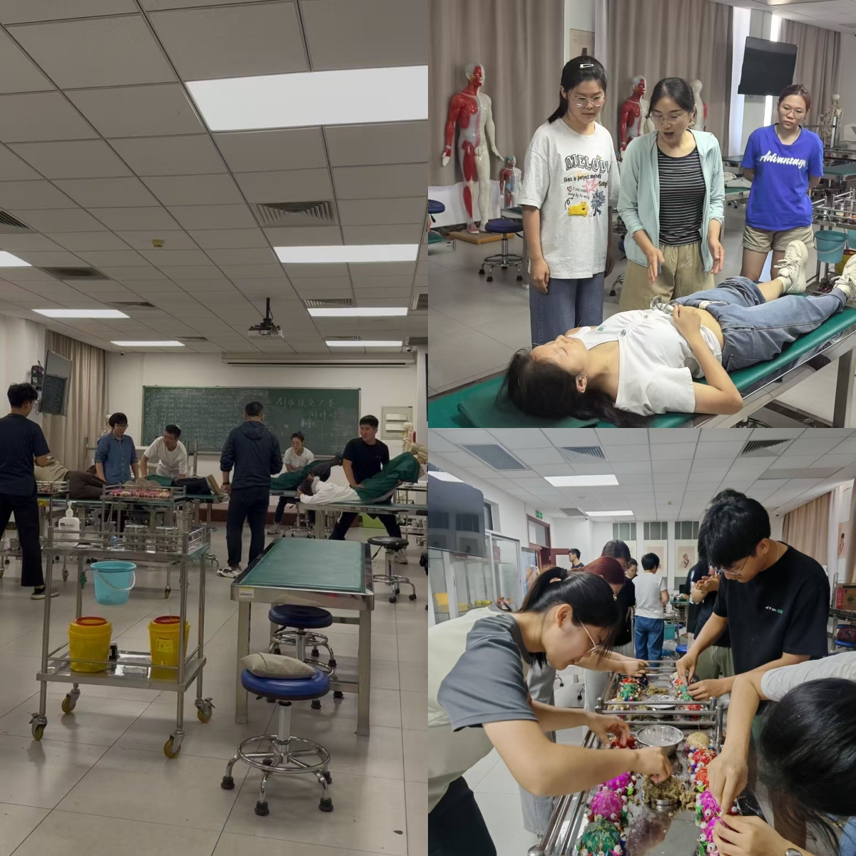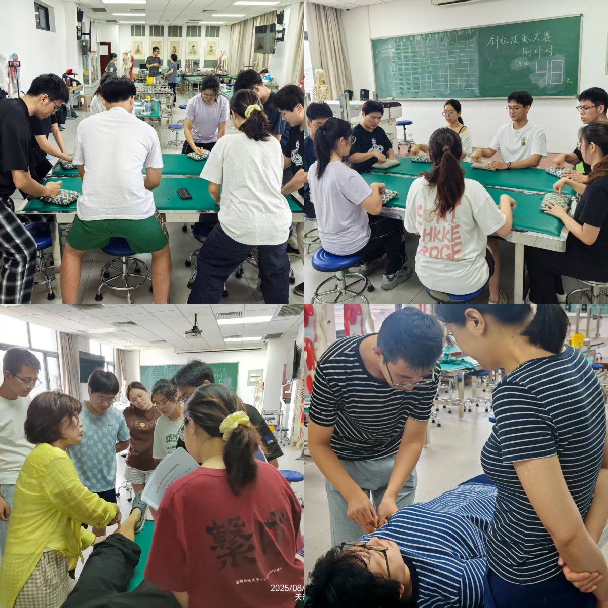 为了强化针灸推拿技能的训练,针灸推拿学院构建了以全国针灸推拿临床技能大赛为轴线的序贯实训操作培育体系,采取“筑基-提升-择优-拔尖”序贯式强化实训操作的培育模式:在大一通过学习推拿功法学、针灸学导论基础课程筑基,训练针灸推拿基本功,组织学生观摩针灸推拿临床技能大赛;在大二学习推拿手法学实训、经络腧穴学(实验)、刺法灸法学(实验)等课程基础上,增设技能实训课时,提升操作技能;面向大一、大二、大三学生开放实验室,组织针推技能大赛院赛选拔环节以赛促练;在大四、大五阶段,学生经过校赛选拔进入暑期集训,低年级学生作为志愿者,配以教练组专项指导,选拔拔尖优秀人才参加国赛。参赛选手,从暑期集训到日常模拟考核,师生们克服高温酷暑、课业压力、考研备考等多重挑战,坚持每日训练、每周测评,深研技术细节,强化操作规范,并专门开展礼仪与临场应变培训,全面提升综合素质。培训期间,学校领导多次亲临现场慰问指导,教务处、附属医院及相关职能部门通力协作,为备赛工作提供了坚实保障。