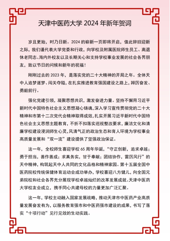 岁且更始,时乃日新。2024的崭新一页即将开启,值此辞旧迎新之际,我们谨代表大学党委和行政,向学校及附属医院师生员工、离退休老同志、海内外校友以及长期关心和支持学校事业发展的社会各界朋友,致以节日的问候和新年的祝福!
