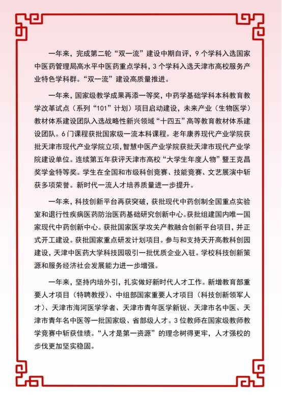 一年来,完成第二轮“双一流”建设中期自评,9个学科入选国家中医药管理局高水平中医药重点学科,3个学科入选天津市高校服务产业特色学科群。“双一流”建设高质量推进。