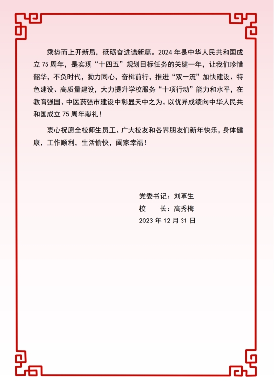 乘势而上开新局,砥砺奋进谱新篇。2024年是中华人民共和国成立75周年,是实现“十四五”规划目标任务的关键一年,让我们珍惜韶华,不负时代,勠力同心,奋楫前行,推进“双一流”加快建设、特色建设、高质量建设,大力提升学校服务“十项行动”能力和水平,在教育强国、中医药强市建设中彰显天中之为。以优异成绩向中华人民共和国成立75周年献礼!