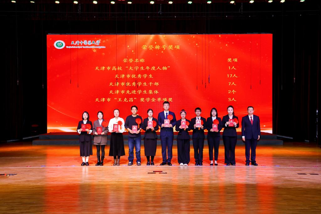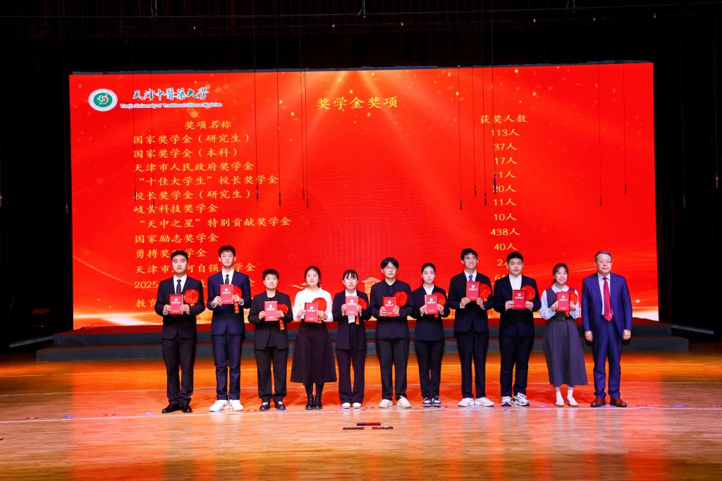 表彰大会上,校党委副书记张华泉宣读了《关于表彰天津中医药大学2025年优秀学生及先进集体的决定》。在即将过去的2025年,我校学生坚定理想信念、加强品德修养、夯实专业技能、陶冶道德情操、增长本领见识,躬耕实践,奋楫争先,在各类学科竞赛、专业竞技、评奖创优中取得了优异成绩,充分彰显了天中学子的优秀综合素质。为选树典型、表彰先进,充分发挥学生榜样的示范引领作用,学校领导为获奖学生代表颁奖表彰。
