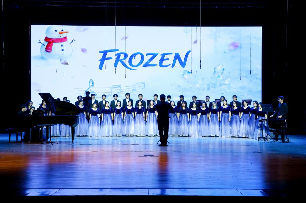 在第二篇章,大学生合唱团献上《满城烟花》《冰雪奇缘》组曲与《金庸武侠主题集锦》三首佳作。从《满城烟花》中阖家团圆的温馨暖意,到《冰雪奇缘》组曲里充满奇幻色彩的童话世界,再到《金庸武侠主题集锦》中快意恩仇的江湖侠义与朝气蓬勃的青春情怀,合唱团以精湛的多声部交织技巧,层层递进地传递出丰富情感,充分展现了合唱团扎实的演唱功底与多元的艺术表现力,每一个音符都直抵人心,赢得现场阵阵掌声。