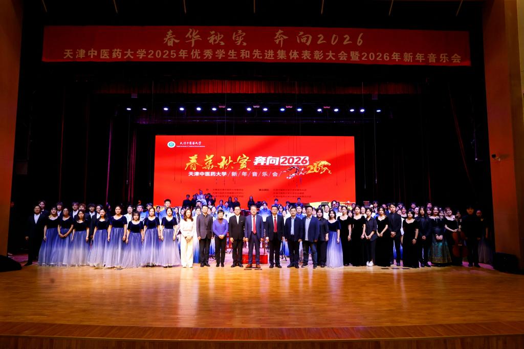 12月30日下午,我校在明德会堂一楼报告厅举办“春华秋实 奔向2026”天津中医药大学2025年优秀学生和先进集体表彰大会暨2026新年音乐会。校党委书记刘革生、党委副书记张华泉、驻校纪检监察组组长柳春敏、副校长张俊华出席,学校各职能处室、各学院、附属医院党政负责同志及师生代表900余人参加此次活动。表彰大会由党委学工部部长吴波同志主持。
