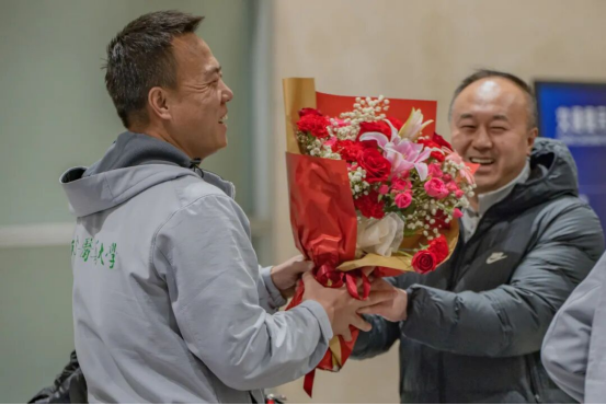 机场大厅内,一场简短而温馨的迎接仪式如期举行。校领导一行亲切问候了每一位归来的支教师生,并为他们佩戴上象征胜利与荣耀的红色围巾。工作人员随即送上了热气腾腾的奶茶,作为大家冬天返津的“第一杯奶茶”。一声“欢迎回家”,伴随着手中暖饮的温度,瞬间驱散了旅途的寒意与疲惫,让师生们在踏上津门大地之初便深切感受到了学校的关怀与牵挂。校党委副书记张华泉代表学校向支教团全体成员致以诚挚的祝贺,并转达了全校师生的深切挂念与问候。他对支教团成员在疆期间的辛勤耕耘和无私奉献给予高度肯定,勉励大家珍惜这段宝贵的经历,在未来的学习工作中继续发扬艰苦奋斗的精神。